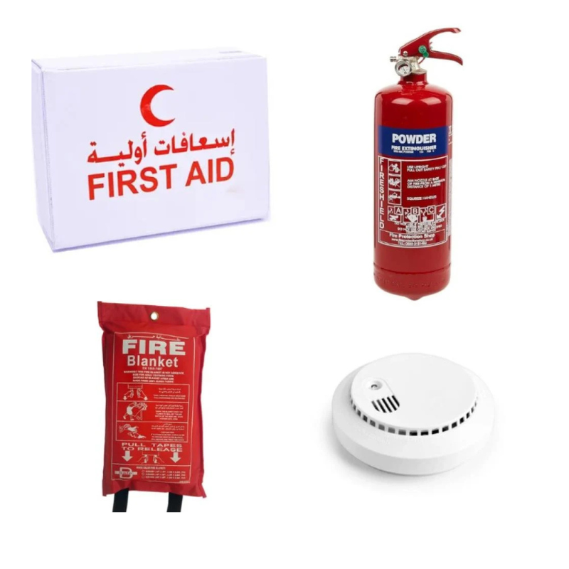 - الماركة: طفاية 1 كيلو – بطانية حريق 120*120 -كاشف دخان بطارية – شنطة اسعاف رقم 1 – يحتوي على عدة علامات تجارية معتمدة